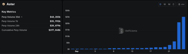Децентралізована біржа Aster випередила Hyperliquid за добовим обсягом торгів. За даними DeFi Llama, за останні 24 години показник платформи досяг $20,8 млрд проти $9,7 млрд у конкурента.