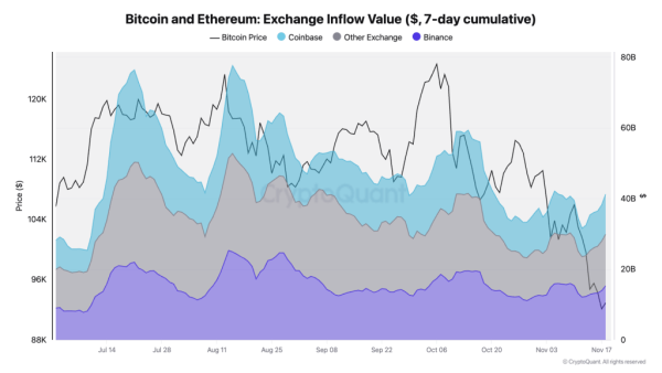 Binance приваблює понад третину загального притоку біткоїну та Ethereum на централізовані біржі. Загальний денний обсяг надходжень двох основних криптовалют на торгові майданчики зріс до $40 млрд, з яких $15 млрд припадає на Binance. Coinbase посідає друге місце з $11 млрд.