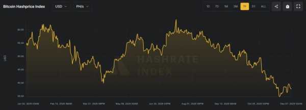 У результаті листопадового обвалу першої криптовалюти нижче $83 000 хешпрайс досяг річного мінімуму ~$35 за PH/s. Незважаючи на подальше відновлення, показник не піднявся вище за $40.
