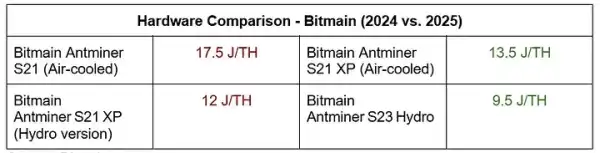 У травні Bitmain представила флагман новітньої серії біткоін-майнерів Antminer S23 Hydro із заявленою енергоефективністю 9,5 J/TH. Порівняльна таблиця демонструє, як провідний виробник удосконалив цей параметр своїх установок за останні два роки.