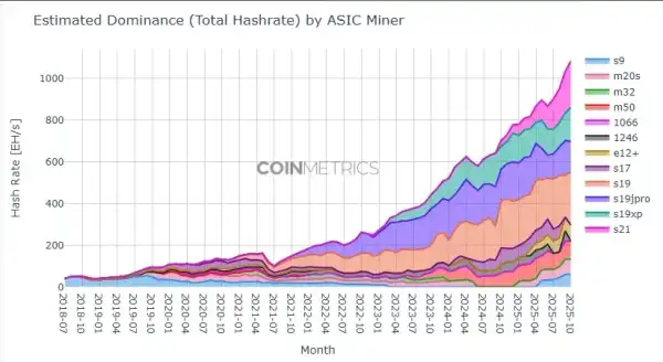 Зростання з початку січня склало близько 25%. За даними Coin Metrics, значний внесок у нього забезпечило масове розгортання установок лінійки Antminer S21 із енергоефективністю 13–16,5 J/TH залежно від модифікації. Їхня частка в сукупному хешрейті до жовтня досягла приблизно 20%.