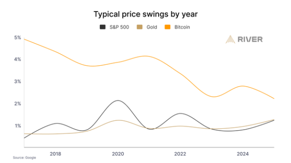 За даними River, 23 держави володіють біткоїнами через майнінг, конфіскації або резерви державних структур. Волатильність біткоїну знижується та наближається до показників золота та індексу S&P 500, що вказує на його поступове визнання як зрілого класу активів.