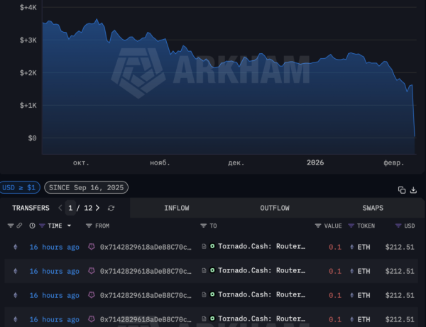 Адреса зломщика придбала ефір на суму $13,3 млн, коли ціна активу опустилася до $2109. Після цього кошти були переведені в протокол мікшування Tornado Cash, що приховує сліди транзакцій. Це перші зафіксовані транзакції гаманця з серпня 2025 року, коли з адреси було продано ефір на $7,4 млн за ціною близько $4202, близькою до річного максимуму монети.