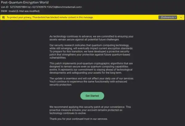 У своїй розсилці шахраї лякають користувачів своїми дослідженнями про квантові обчислення, які можуть зламати чинні стандарти шифрування. Це означає, що пристрої та криптоактиви користувачів знаходяться під загрозою, тому аферисти пропонують вирішення проблеми — завантажити патч, який нібито посилить захист гаманців від майбутніх вразливостей.