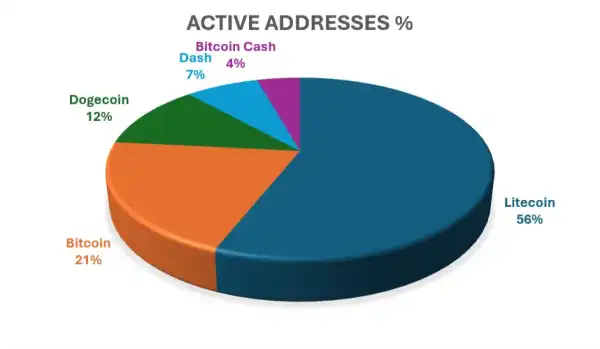 Litecoin зайняв перше місце серед тих, хто використовує метод консенсусу доказу роботи (Proof-of-Work, PoW) блокчейнів за часткою щоденних активних адрес.