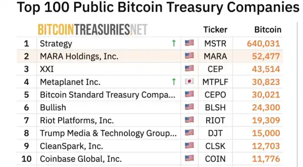 Оглядач BitcoinTreasuries.NET показав, що остання угода Metaplanet щодо купівлі біткоїнів на 91,6 млрд ієн ($600 млн) підняла японську компанію в рейтингу корпоративних власників біткоїнів відразу на дві позиції, дозволивши обігнати Bitcoin Standard Treasury Company.