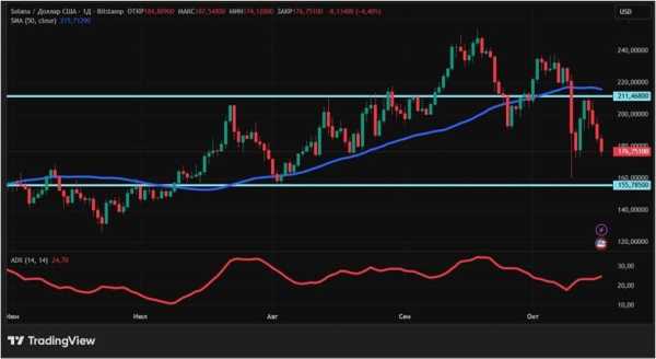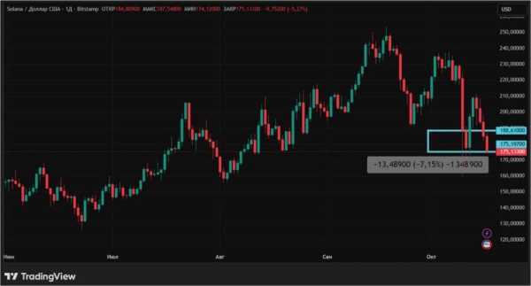 Solana з 10 до 17 жовтня втратила 7,15%. У другій половині тижня ціна криптовалюти опустилася із $211 до $175. За останні чотири торгові сесії падіння у відсотковому співвідношенні збільшувалося з кожним днем.