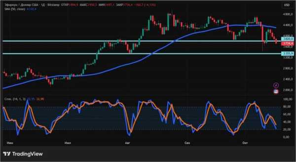 З погляду технічного аналізу тренд ефіру — низхідний. Про це говорить розташування ціни нижче 50-денної ковзної середньої (позначена синім кольором). Переважання ведмедів підтверджується стохастиком, що знижується, який не дійшов до зони перепроданості. Найближчі рівні підтримки та опору за денним графіком: $3355,9 та $3820 відповідно.