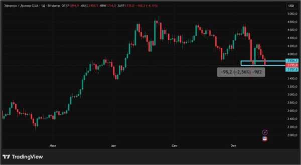 Ефір із 10 по 17 жовтня впав на 2,56%. Як і у випадку з біткоїном, ETH зростав на початку тижня. Проте чотири мінусові сесії поспіль, з 14 по 17 жовтня, забрали вартість другої за капіталізацією криптовалюти нижче за $4000.
