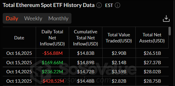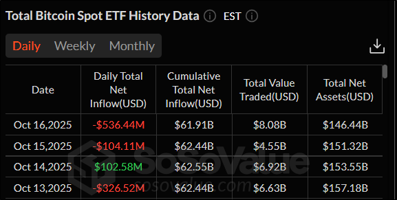 Спотові ETF на біткоїн також демонструють негативну статистику. У трьох торгових сесіях із чотирьох біржові фонди фіксували відтік коштів. Сумарно він становив понад $850 млн. Лише у вівторок, 14 жовтня, стався приплив грошей до спотових BTC-ETF розміром $102,58 млн. Проте загальної негативної динаміки він змінити не зміг.