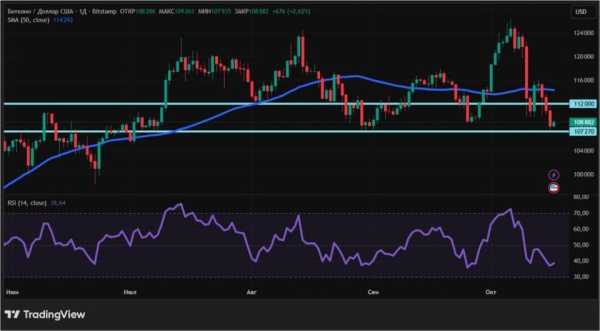 З погляду технічного аналізу, тренд біткоїну — низхідний. На користь цього свідчить розташування ціни нижче 50-денної ковзної середньої (позначена синім кольором). Ведмежі настрої інвесторів підтверджуються і даними RSI. Цей осцилятор вже опустився нижче за рівень 50 і продовжує падіння. До зони перепроданості (нижче 30) він ще не дістався, що теж не обіцяє покупцям (бикам) чогось позитивного. Зараз BTC прийшов до зони підтримки, сформованої ще наприкінці серпня і на початку вересня — в районі $107 000-$108 000. Якщо втриматися вище не вдасться, швидше за все розпродаж триватиме. Говорити про зміну тренду варто тільки після того, як біткоїн підніметься вище за найближчий за денним графіком рівень опору — близько $112 000.