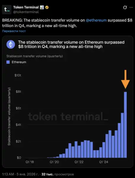 Обсяг переказів стейблкоїнів у мережі Ефіріум перевищив $8 трлн у четвертому кварталі 2025 року — це новий історичний максимум, випливає з даних аналітичного сервісу Token Terminal.