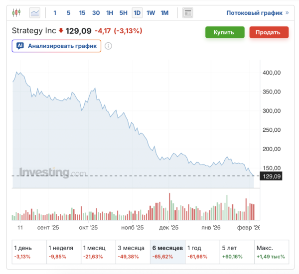 У четвер, 5 лютого, акції Strategy торгуються близько $129. За останній місяць на тлі обвалу біткоїну котирування компанії просіли більш ніж на 20%, а з жовтневого піку – на 50%.