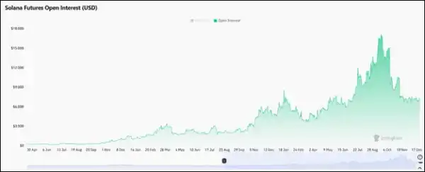 А от щодо відкритого інтересу справи куди як гірше. З вересневого історичного максимуму $17,1 млрд показник обвалився на 58%. Інтерес інвесторів до деривативів на Solana, зокрема на ф'ючерси, явно послабшав. Із позитивних моментів можна відзначити такий: у діапазоні від $6,6 млрд до $7,5 млрд показник перебуває вже майже півтора місяці. Іншими словами, нижче відкритий інтерес щодо ф'ючерсів на Solana не опускається.