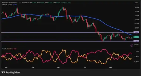 З погляду технічного аналізу, тренд біткоїну залишається низхідним. По-перше, це випливає з ціни, розташованої нижче 50-денної ковзної середньої (позначена синім кольором). По-друге, підтвердженням продовження ведмежого тренду виступає індикатор Vortex, лінія VI-(рожева) якого перевищує VI+ (помаранчеву). Рівні підтримки та опору на денному графіку порівняно з минулим тижнем не змінилися: $83814 та $94652 відповідно.