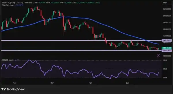 З погляду технічного аналізу ведмежий тренд Solana зберігається з початку жовтня. Саме тоді ціна опустилася нижче 50-денної ковзної середньої (позначена синім кольором) і так відтоді не піднялася. Індикатор RSI також не вселяє оптимізму, оскільки знаходиться нижче значення 50. Найближчі рівні підтримки та опору на денному графіку: $116,86 та $146,93 відповідно.