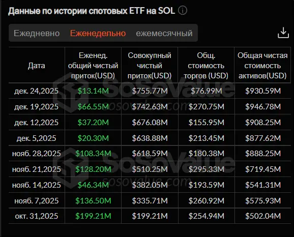 Новинка для Solana неоднозначний. З одного боку, спотові ETF на SOL зафіксували серію із п'ятнадцяти торгових сесій припливу коштів поспіль. З іншого, розмір вливань інвесторів до спотових біржових фондів на Solana не йде ні в яке порівняння з аналогічними фондами на біткоїн та ефір. За три торгові сесії, що пройшли цього тижня, обсяг вкладених коштів становив скромні $13,14 млн. До речі, якщо дивитися в семиденному розрізі, то ще жодного разу спотові ETF на SOL не зафіксували відтік грошей.