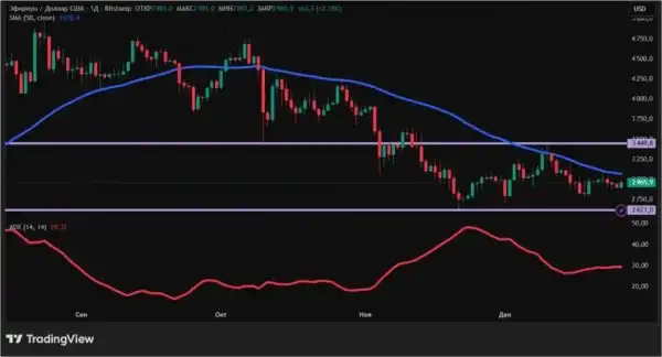 З погляду технічного аналізу ефір залишається в низхідному тренді. Про це говорить розташована нижче 50-денної ковзної середньої (позначена синім кольором) ціна. А от сказати, що ведмеді збільшують тиск, не можна. Індикатор ADX ось уже другий тиждень дрейфує близько 30. Найближчі рівні підтримки та опору на денному графіку: $2621 та $3449,8 відповідно.