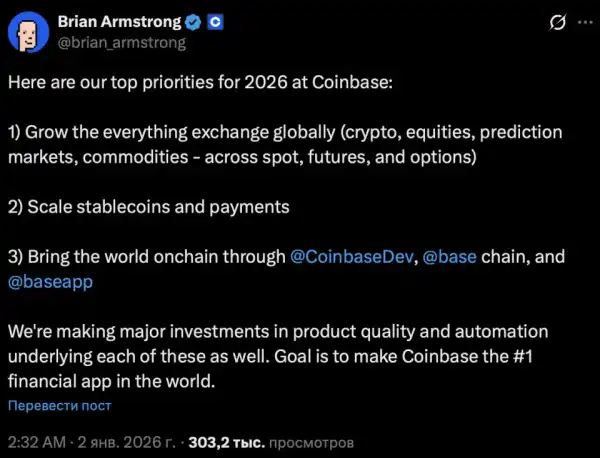 Завдання номер один на 2026 рік, за словами Армстронга, зробити з Coinbase глобальну біржу, що охоплює всі види цінних паперів: криптовалюти, акції, ринки прогнозів, сировинні товари — на спотовому ринку, ф'ючерсах та опціонах. Крім того, гендиректор платформи розраховує на масштабування стейблкоїнів та платежів, що проходять через біржу. Ще одне завдання на рік – залучення користувачів у блокчейн через ланцюжки Base.