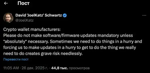 Криптограф, один із засновників Ripple та її колишній головний технічний директор Девід Шварц (David Schwartz) попросив виробників та операторів криптогаманців не робити оновлення софту чи прошивки обов'язковими без крайньої необхідності.