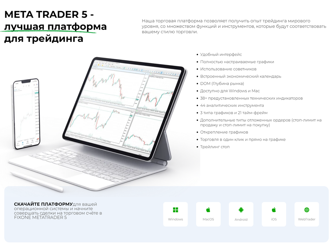 Мы развернули собственный торговый терминал Fixone Meta Trader 5, в который внедрили многие новинки на трейдинговом рынке. Благодаря этому мы можем обеспечивать нашим клиентам инновационные инструменты и технологии, которые помогут им принимать обоснованные инвестиционные решения. Meta Trader 5 — единая платформа для 9 финансовых рынков.