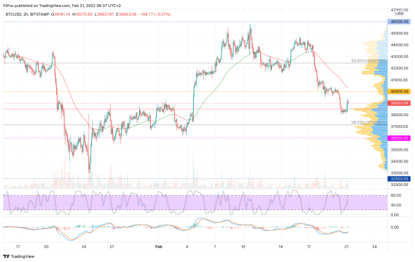 Минулої суботи ціна біткоїну намагалася закріпитися на психологічному рівні 40000.00 USD у вузькому бічному діапазоні. Однак, у неділю вранці ведмеді вибили пару з боковика і відтіснили ціну BTC до підтримки 38000.00 USD, де рух у вузькому діапазоні продовжився до завершення дня.
